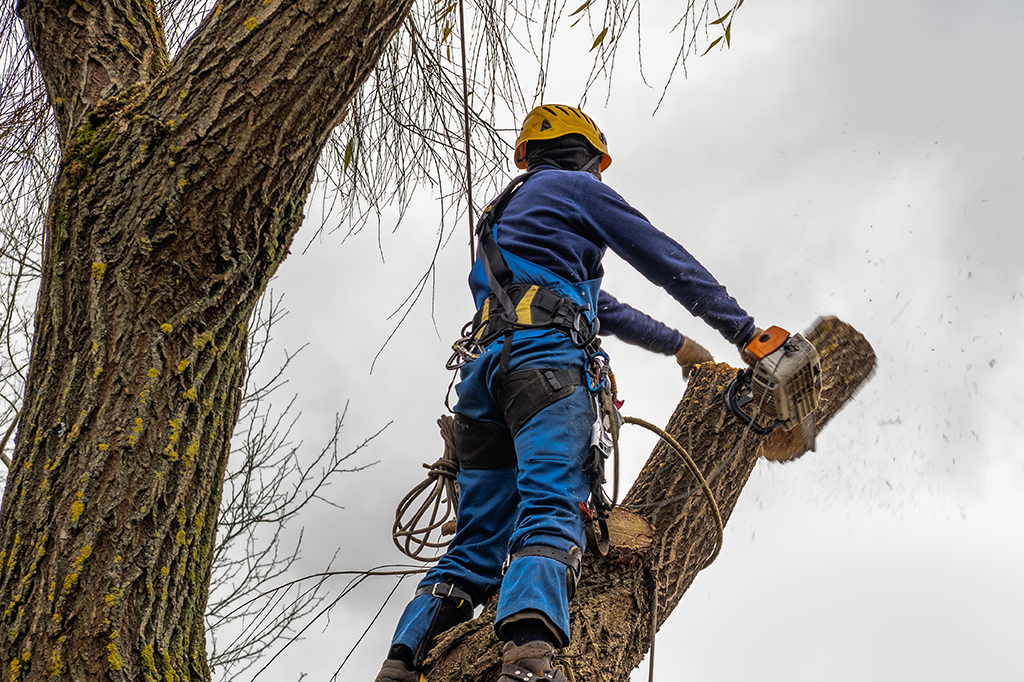 Using climbing gear, rigging, or bucket trucks, depending on tree height and accessibility.